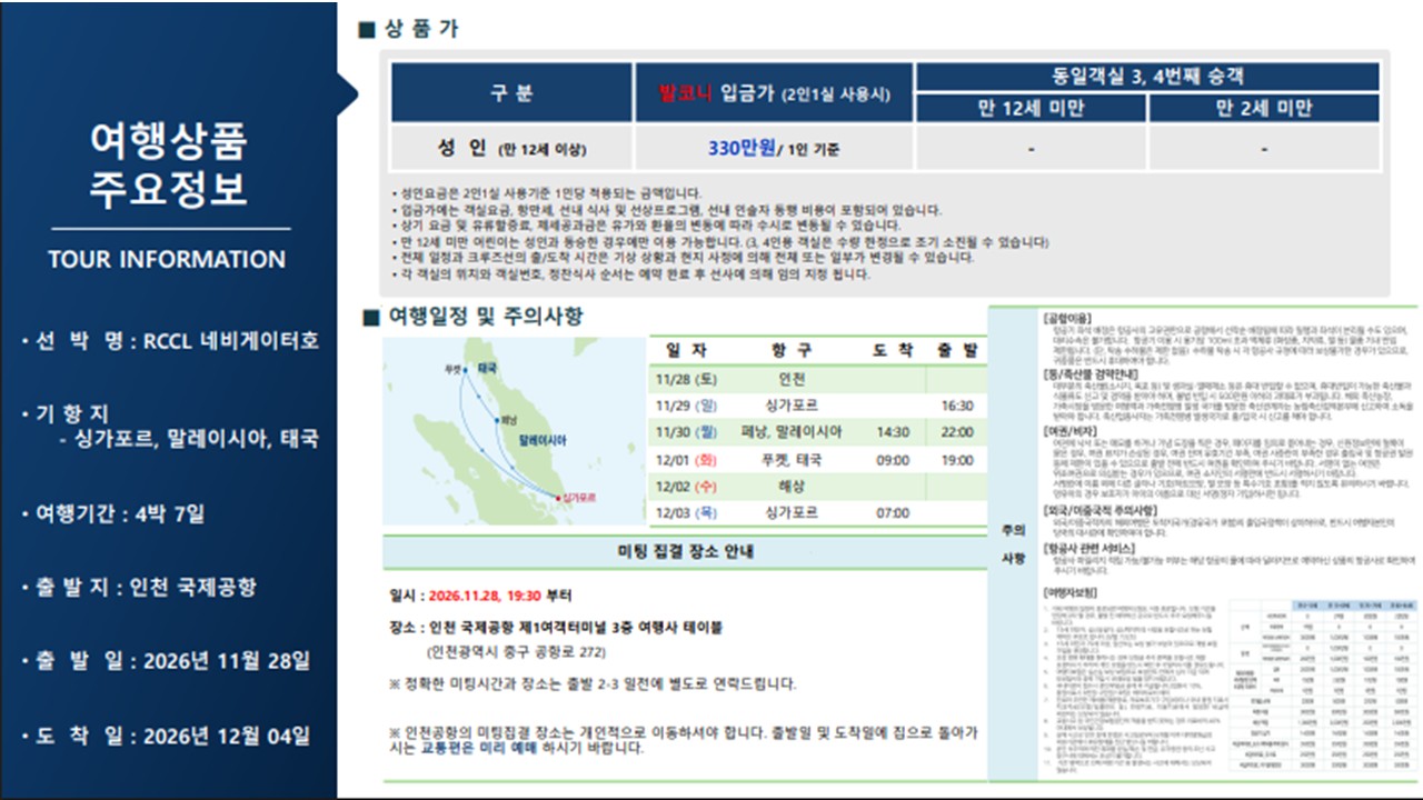 | 여행기간 | 2026년 11월 28일 (토) ~ 2026년 12월 04일 (금) 4박 7일 |
